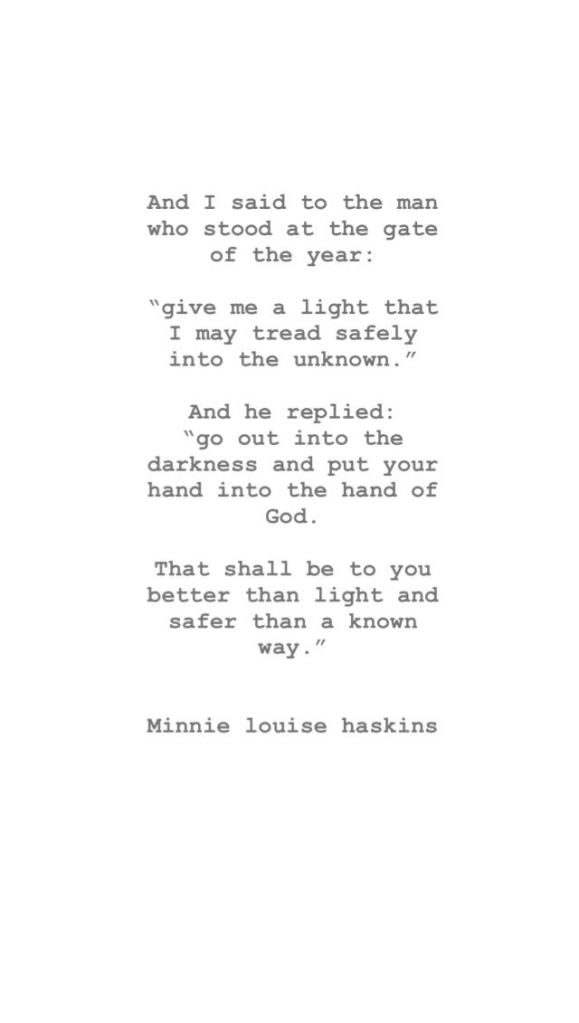 September of 1939 was a frightening time for Britain as the nation had just declared war on Germany. In his Christmas broadcast of that year, King George VI addressed the British Empire in an effort to encourage and inspire for the troubling times ahead. He chose to quote from English author Minnie Louise Haskins — a poem which was originally published as “God Knows” in 1908, but soon became known as “The Gate of the Year.”